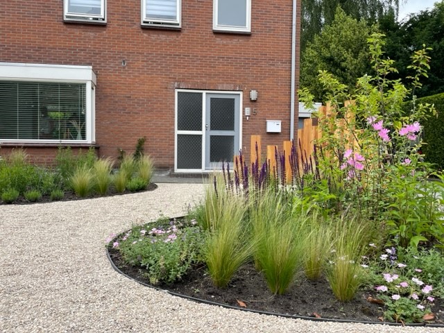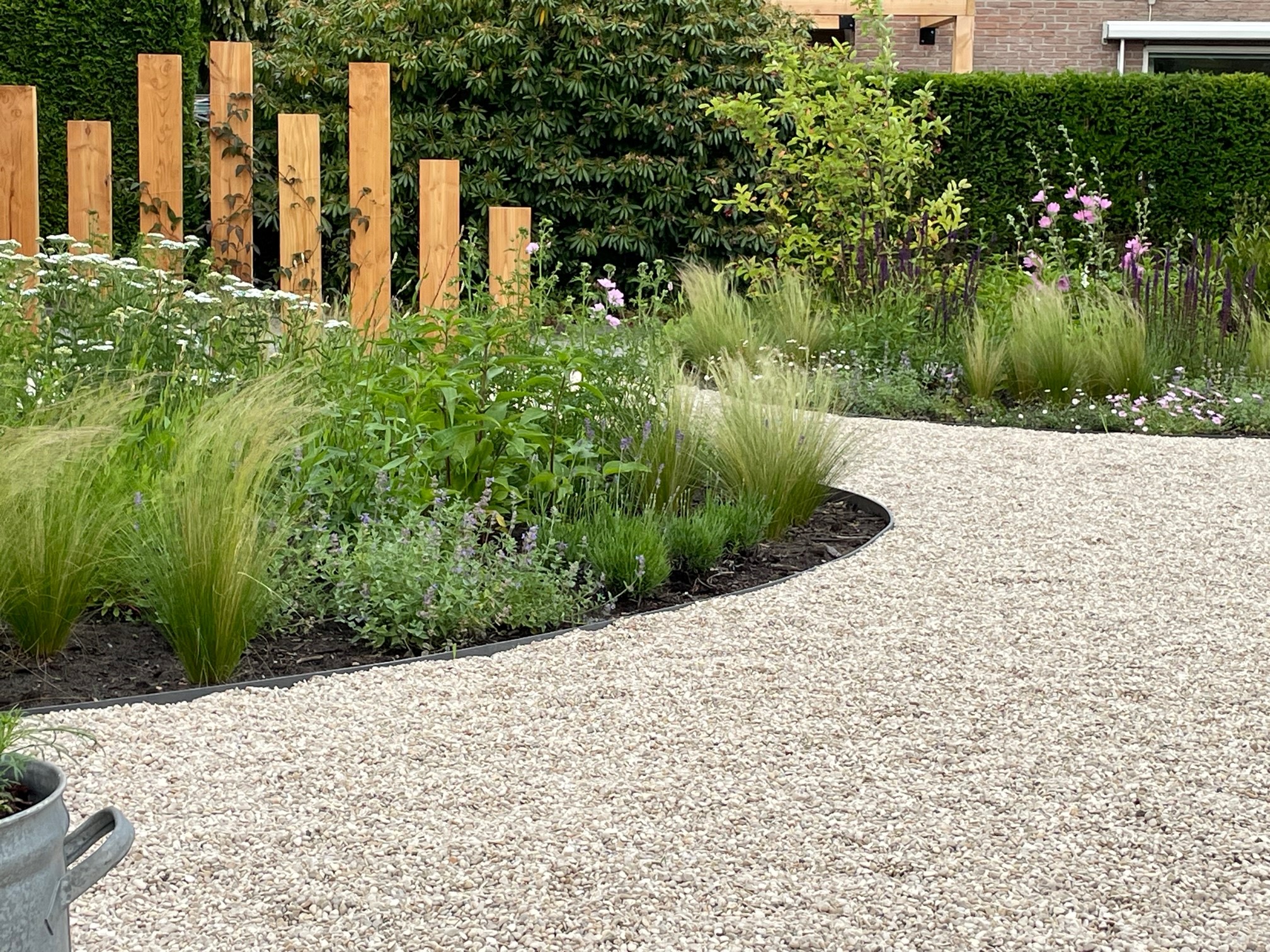Een lege voortuin die alleen bestaat uit gras wordt omgetoverd naar een bloemrijke en avontuurlijke ruimte waarin ronde borders vol natuurlijke beplanting gecombineerd worden met grindpaden en een pergola met klimplanten. De voortuin bestond eerst alleen uit gras met in een hoek een kleine border. De bewoners willen graag veel bloemen, kleur en natuurlijke materialen. De tuin die ik voor hen ontworpen heb bestaat uit verschillende borders die gevuld worden met veel bloeiende planten en heesters voor het groene geraamte. In een hoek komen een aantal vruchtstruiken en over de pergola groeit o.a. een druif waardoor je naast de beleving van heel veel bloemen, ook kunt proeven uit de tuin. Het gezin heeft 2 jonge kinderen die graag buiten zijn dus in de tuin zijn verschillende plekken gecreëerd waar de kinderen kunnen zitten, spelen en kijken. Een hangstoel, boomstammen om op te zitten, een hoekbankje afgeschermd door een scherm van houten palen en een insectenhotel maken van de voortuin een heerlijke plek om te zijn en te genieten van al het moois wat de natuur te bieden heeft. Omdat de voortuin aan een doodlopende weg ligt, is er genoeg ruimte om iets meer te doen met de voortuin dan alleen wat planten. Je kunt er nu ook in verblijven en wanneer je dat niet wilt, dan heeft de tuin nog zoveel om naar te kijken door de vele borders en de prachtig begroeide pergola.